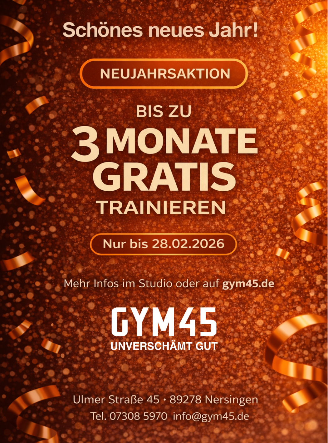 Entdecke unsere spannenden Aktionen im GYM45 in Nersingen, die Dein Krafttraining auf ein neues Level heben werden. Von exklusiven Rabatten über spezielle Workshops bis hin zu herausfordernden Challenges – unsere Aktionen sind darauf ausgerichtet, Dein Trainingserlebnis zu maximieren und Dich zu neuen Höchstleistungen zu motivieren. Verpasse keine unserer UNVERSCHÄMT aufregenden Aktionen und profitiere von besonderen Angeboten, um Dein Krafttraining auf die nächste Stufe zu bringen. Sei bereit für ein Trainingserlebnis voller Power und Innovation!